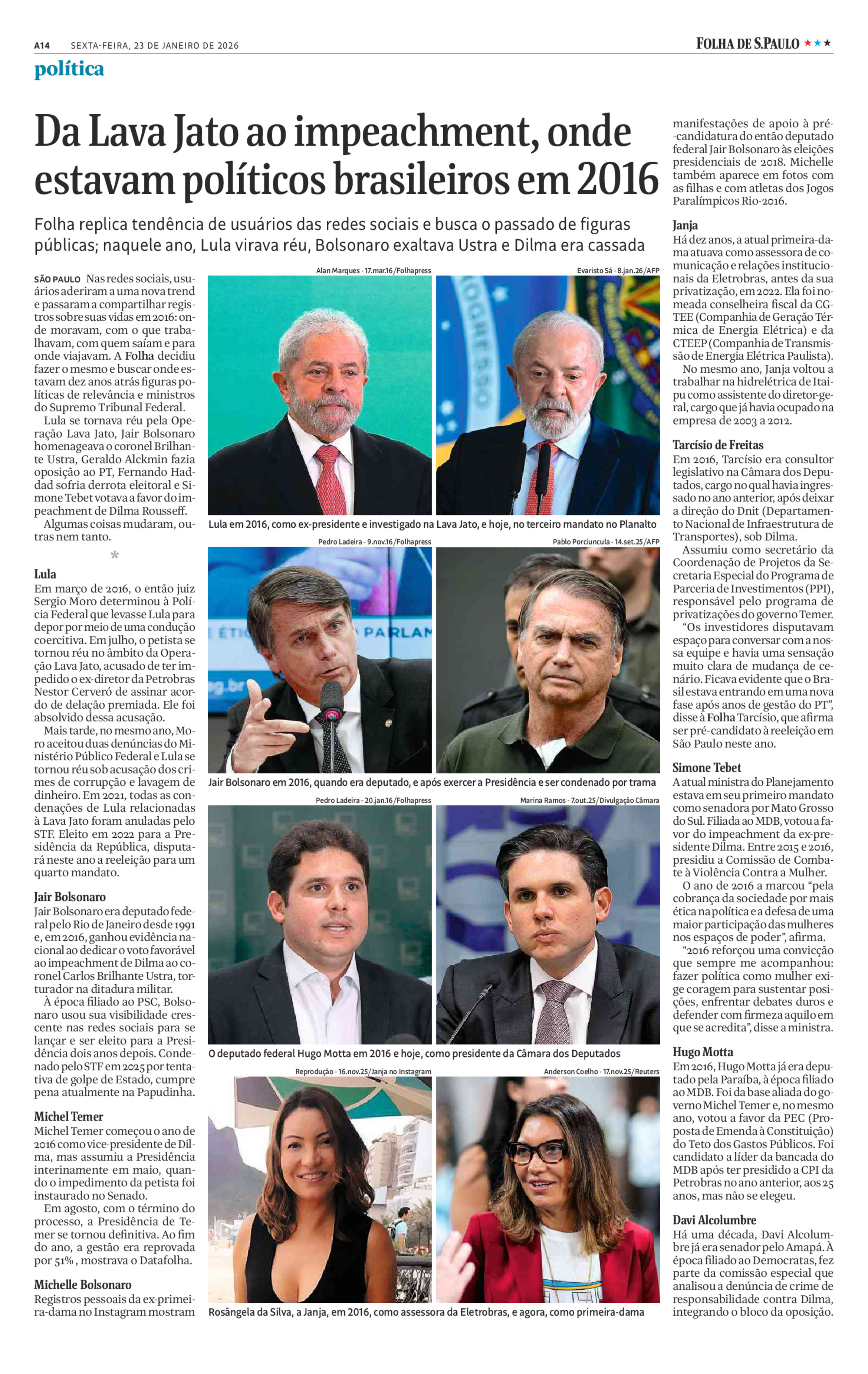 Folha replica tendência de usuários das redes sociais e busca o passado de figuras públicas; naquele ano, Lula virava réu, Bolsonaro exaltava Ustra e Dilma era cassada.