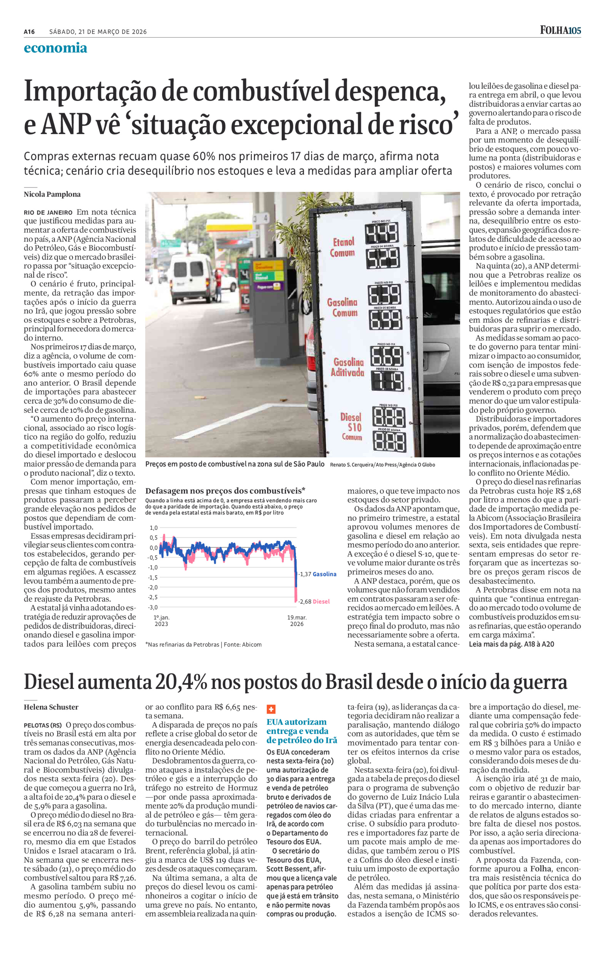 Governadores resistem a zerar o ICMS sobre o produto devido a impacto orçamentário e dificuldades técnicas. O preço do óleo já subiu 20,4% nos postos desde o início do conflito no Irã; eventual continuidade da guerra exigirá realismo de cotações. (FolhaSP)